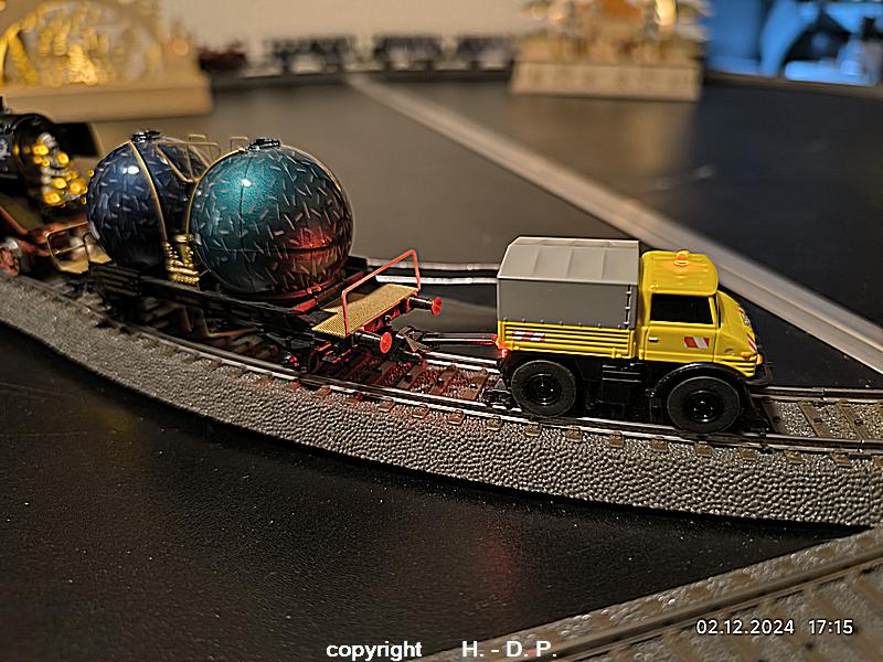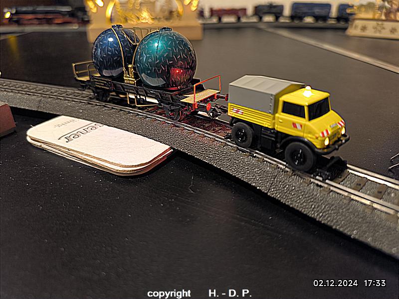 Heute kam meine im letzten Jahr von den Kollegen des MIST 47 zu meinem 75. Geburtstag geschenkte BR 89 und die BR 01 zum Einsatz. Dazu auch noch der 2 Wege Unimog der auch noch einen Weihnachtswagen zog. Da der Unimog heute nicht voll aufgeladen war habe ich nur einen Wagen dran gehängt, aber Morgen werde den noch voll aufladen und dann versuchen mehrere Wage damit zu ziehen, denn das ist auch nur mit dem C - Gleis möglich da es da keinen Versatz an den Schienenstößen gibt.