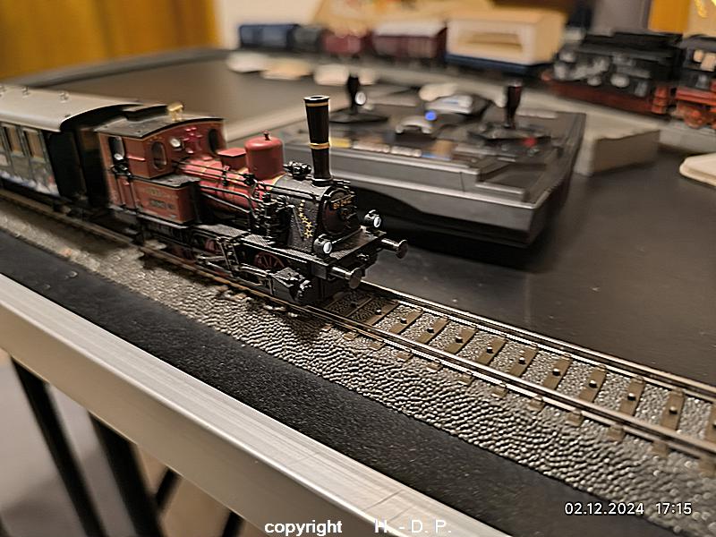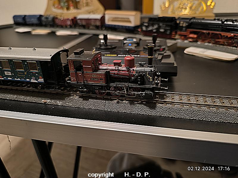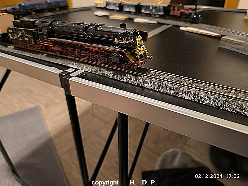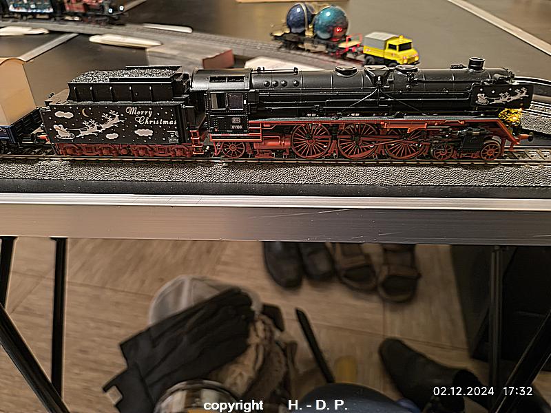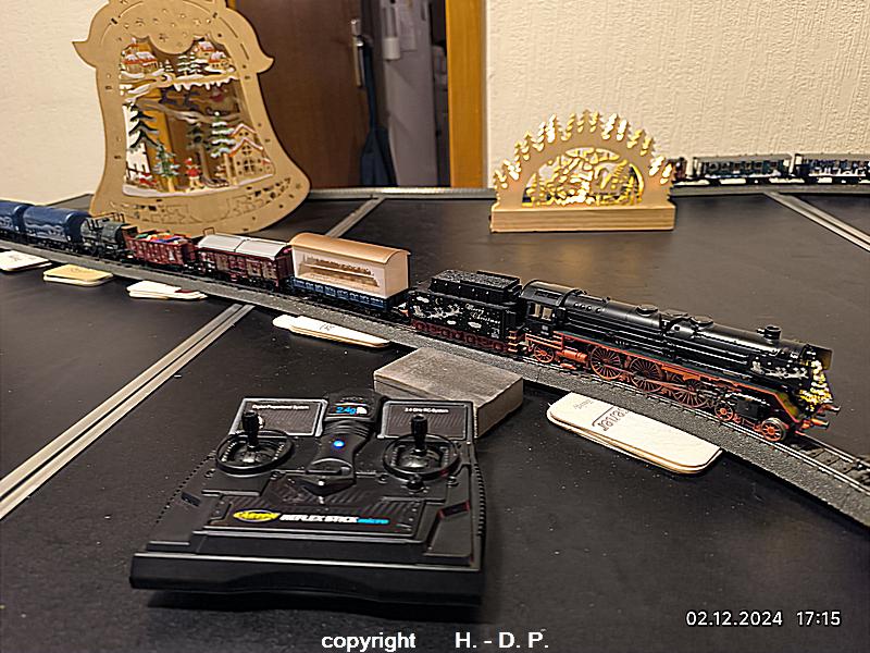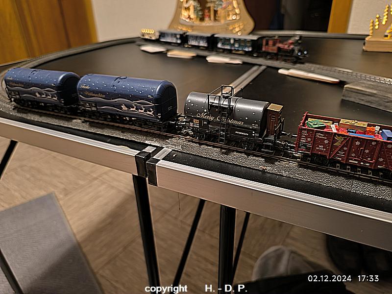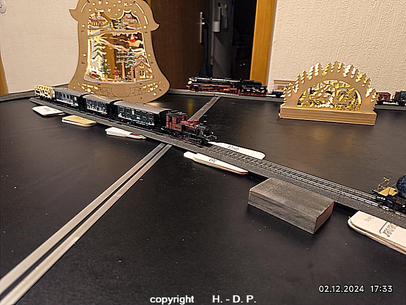 Wie wohl bekannt sein dürfte bin und bleibe ich ein analog Bahner, der aber einmal im Jahr schwach wird und digital fährt. Dieser Ausrutscher findet seit einigen Jahren immer in der Adventszeit statt, weil ich einmal im Jahr den Sound der Weihnachtslok und seit dem letzten Jahr der Weihnachtsloks hören möchte. Dazu werden 3 klappbare Tapeziertische nebeneinander gestellt, diese <tische haben die Maße 1 m x 0,60 m und das ergibt dann ein <oval von 1,80 m Länge. OK das ist nicht groß, aber es macht trotzdem viel Spaß und natürlich kann ich auf der recht kurzen Strecke auch nicht alle meine Weihnachtswagen einsetzen.