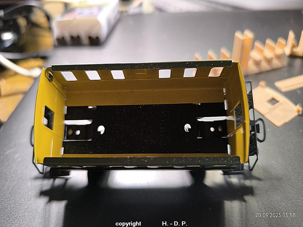Ich habe soeben einen meiner 4040 mit der Inneneinrichtung versehen und das ist ganz einfach, denn es muß nichts geklebt werden. Einfach nur das Dach abnehmen, die beiden Reihen mit den Bänken rechts und links an die Blechwand setzen und in den Spalt am Boden einen Streifen der aus dem selben Material wie die Bänke besteht fest eindrücken. Dann nur noch die beiden Rückwände einsetzen und alles sitzt Bombenfest ohne zu kleben. Ich finde das einfach nur genial.