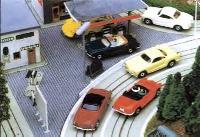 Alle auf diesem Foto zu sehenden Fahrzeuge sind fahrbar. Die Technik an sich ist einfach, es wird in die Modellstraße ein Spezialdraht verlegt. Die Radien sollten so bemessen werden, dass das größte Fahrzeug problemlos die Kurve durchfahren kann. Danach wird der Draht eingespachtelt und mit einer - auch von Faller erhältlichen - Straßenfarbe gestrichen. Dadurch ist der Draht unsichtbar, aber für den Führungsstift der Autos "fühlbar". Auf diesem Draht fahren die Autos je nach Akkugröße bis zu fünf Stunden. Durch Elektromagnete können die Autos beeinflusst werden, so dass man damit z.B. eine Bushaltestelle oder einen Ampelstop einrichten kann. Eine ausführliche Bauanleitung findet man in dieser neuen Broschüre: