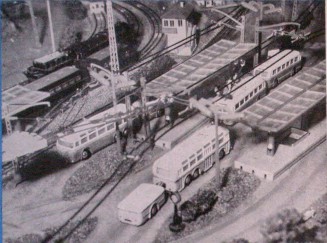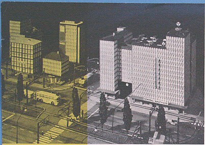 ![]() so sahen in den 50er Jahren moderne Großstädte auf Modellbahnanlagen aus, man beachte das große - aus mehreren Faller Hochhaus Bausätzen - gebaute Haus |